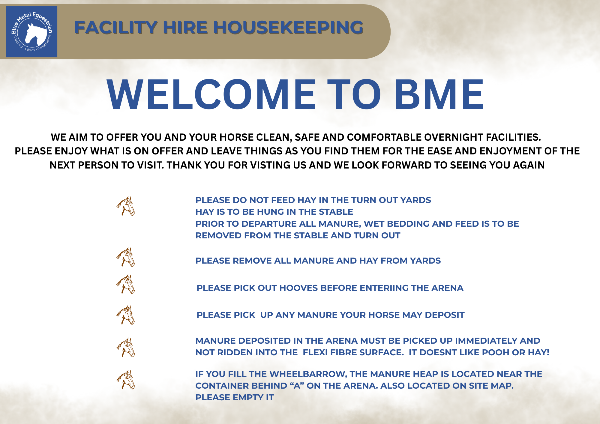 Please bring all feed requirements for your horse including feed bins and hay nets.