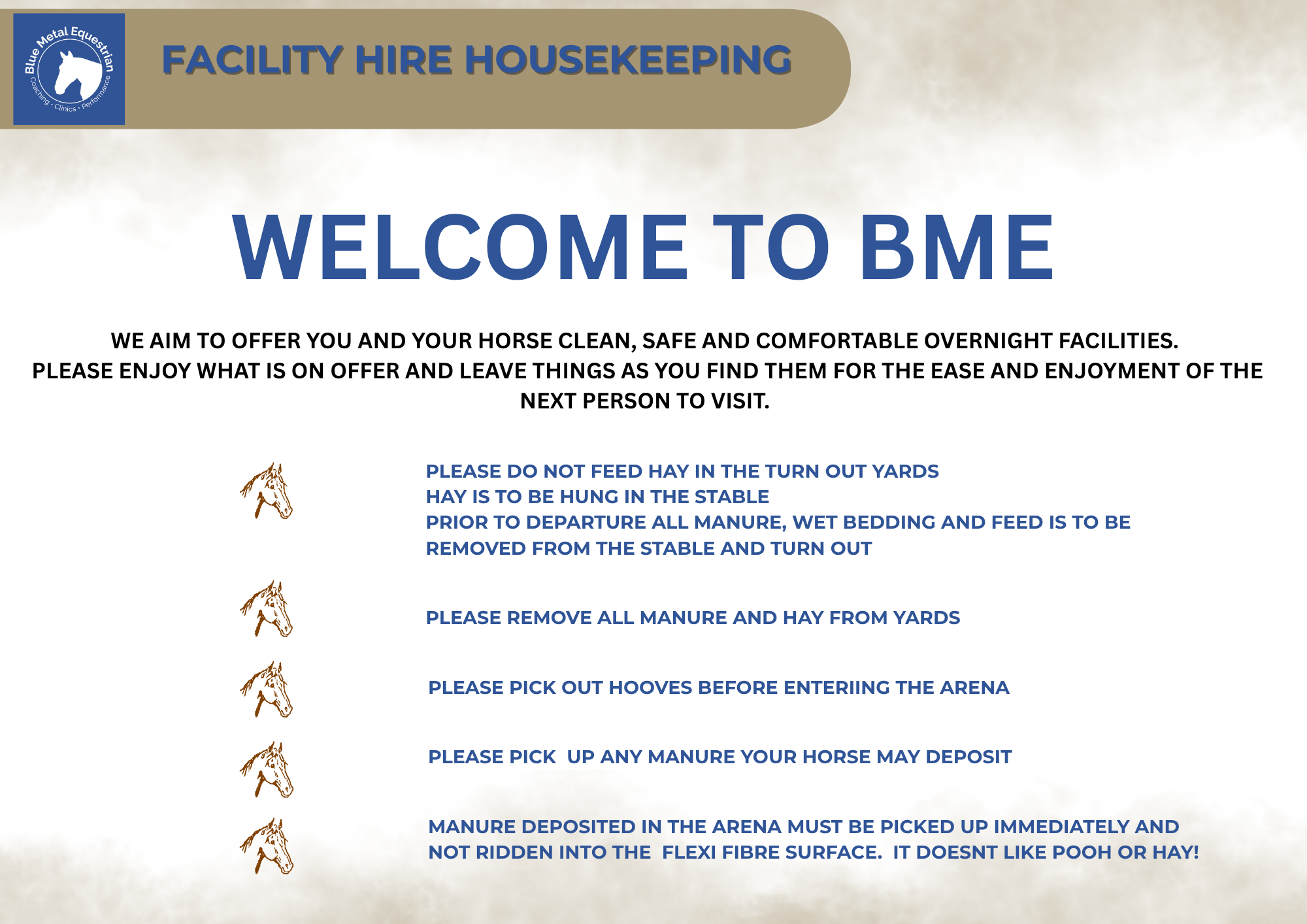 Please bring all feed requirements for your horse including feed bins and hay nets.