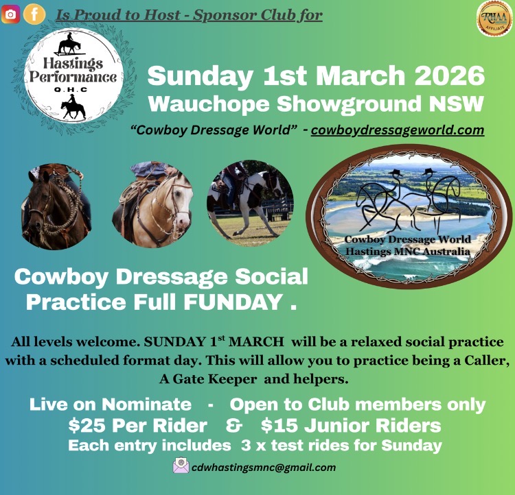 Our Club will be hosting a Cowboy Dressage focused 'Come and Try - Social practice weekend" over the 2 days . This is for ALL MEMBERS new and interested horse lovers to enjoy both our introduction to Cowboy Dressage plus Ranch Patterns and Horsemanship formats. Relaxed social practice weekend Starting on Saturday at 12 noon and Sunday from 8am till mid afternoon.