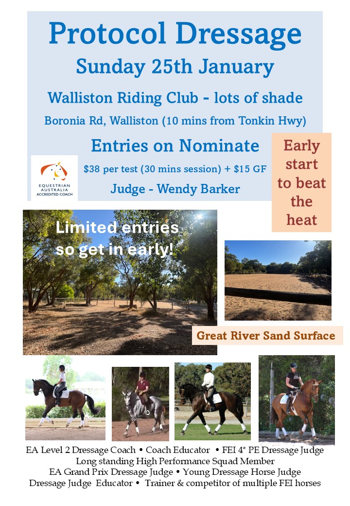 Protocol Day Sunday 25th Jan at Walliston Riding Club, with Wendy Barker.