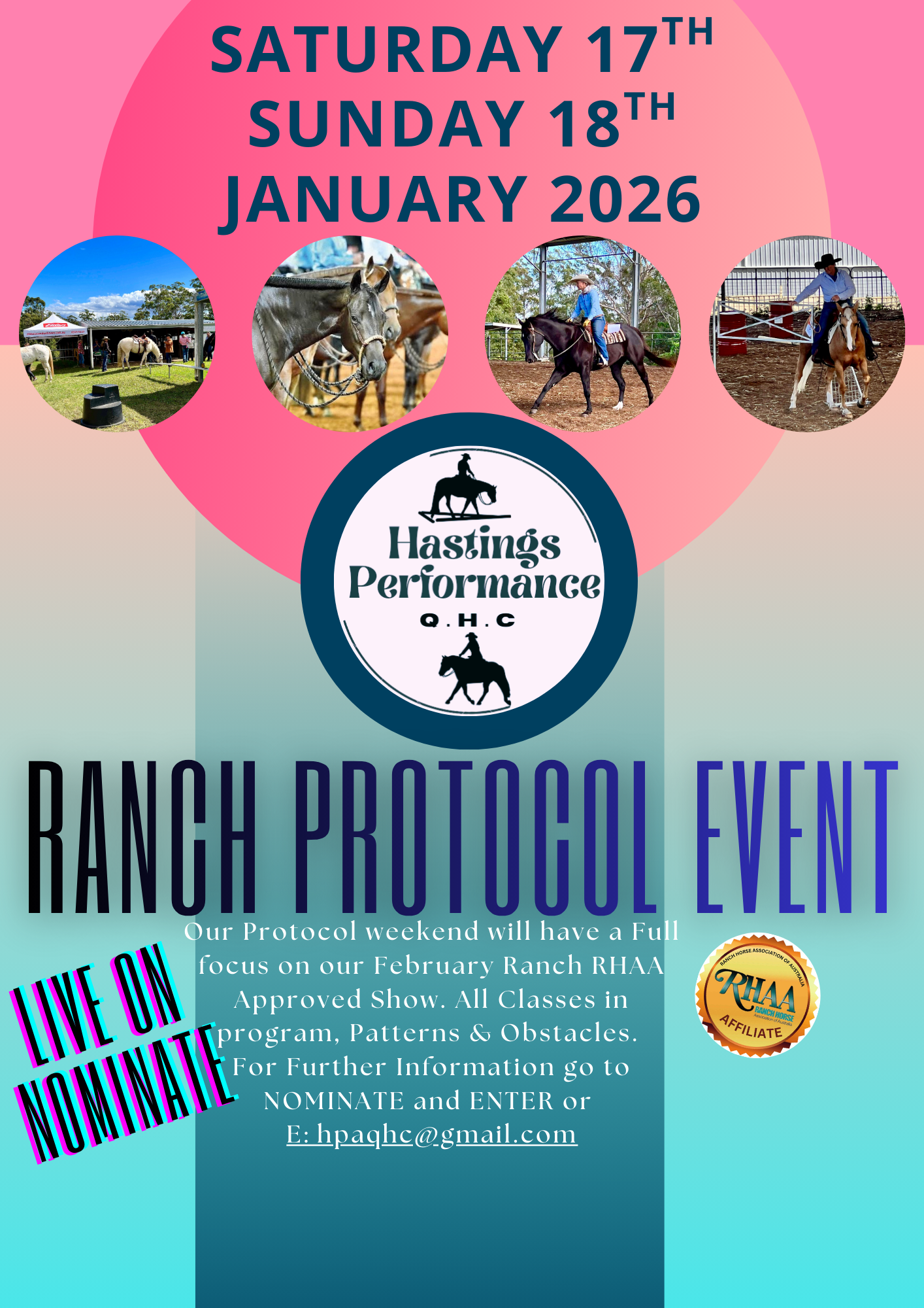 Our Club will be holding a 'RANCH PROTOCOL EVENT - this is a Full weekend AKA 2 day's of Riding the up and coming RANCH RHAA Show program. This is when you "Get omfortable about being uncofortable " in and around a Competative Show Program. This is for ALL MEMBERS new and interested horse lovers to enjoy our Ranch formats.