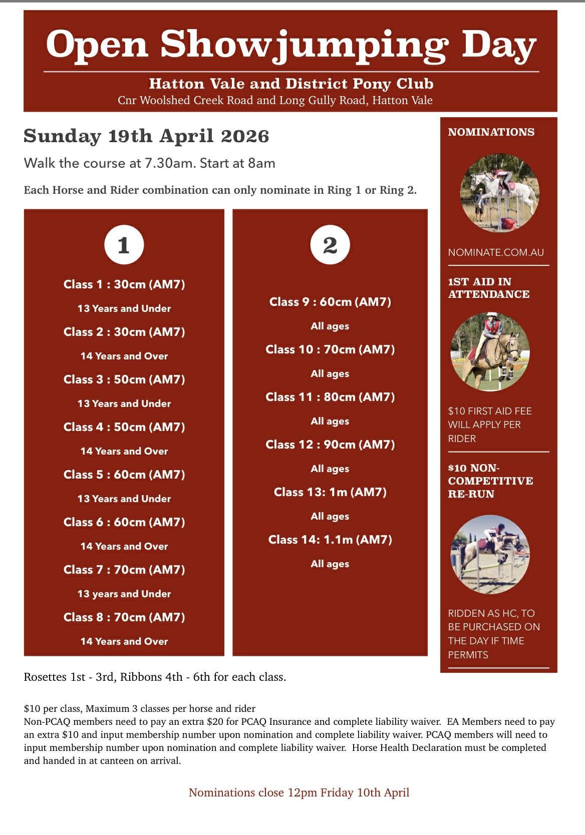 ONLY 1 ENTRY PER CLASS - PER RIDER/HORSE COMBINATION. NOMINATIONS TO BE EITHER RING 1 OR RING 2