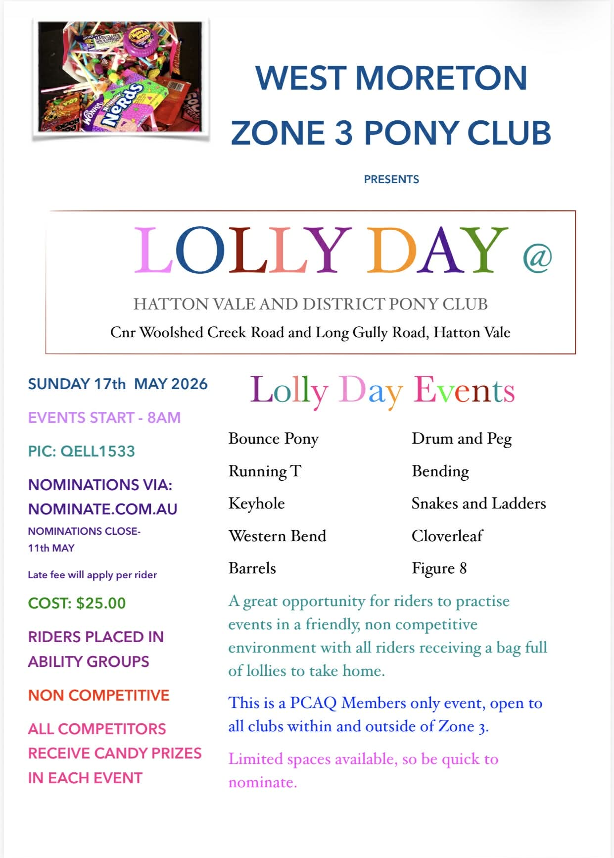 Make sure you bring a bag to carry all your lollies home!! Full canteen available on the day.