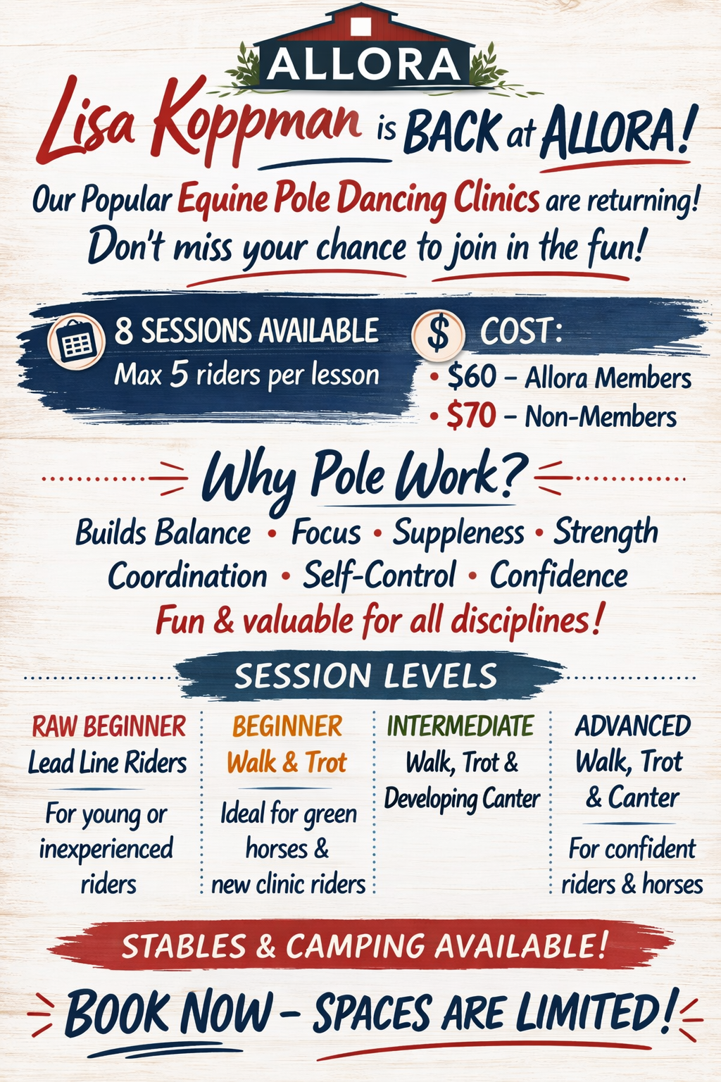 Lisa Koppman is back at Allora for Pole Dancing Clinics – and we couldn’t be more excited! 🎉 Our popular Equine Pole Dancing Clinics with Lisa are returning, and they’re always a favourite with riders and horses alike.