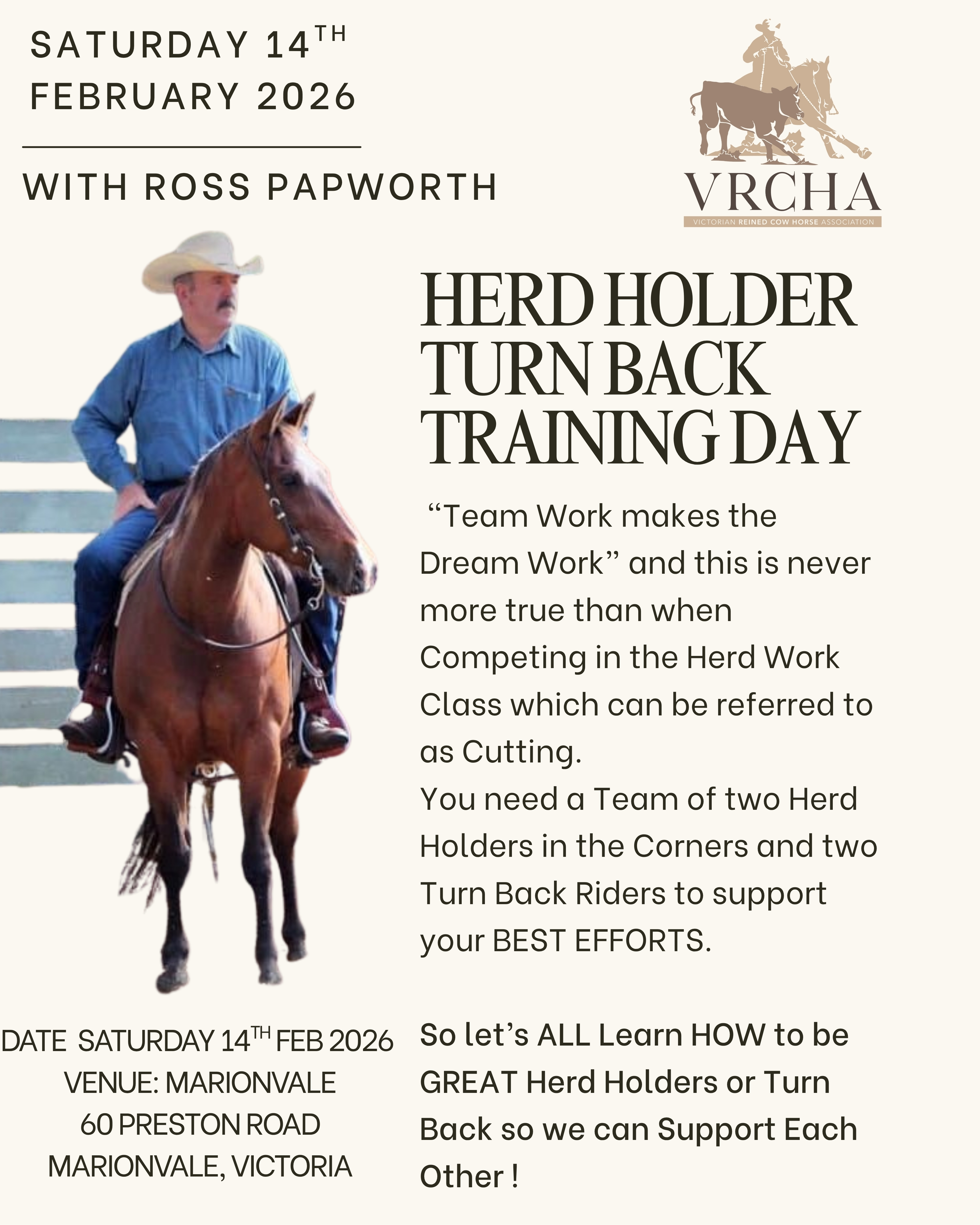VENUE: 60 Preston Road, Marionvale, Victoria Starts: 9.30am Ends: 3.30pm With Ross Papworth Limited to 25 VRCHA Members Fencesitters and Supporters free of charge BYO ALL MEALS