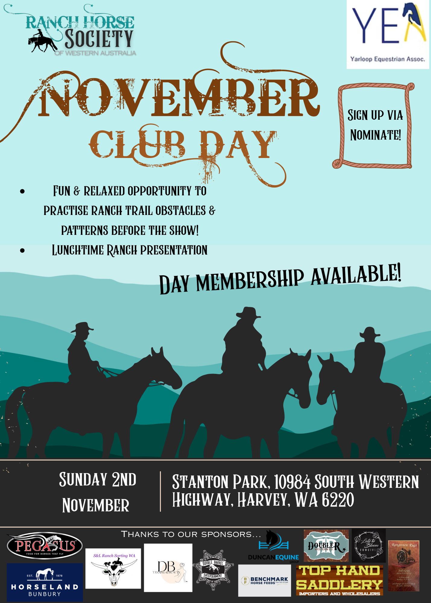 Ranch Horse Society of Western Australia are teaming up with Yarloop Equestrian Association to bring you our November Club Day! This event will be held at Stanton Park in Harvey on Sunday 2nd November 2025.