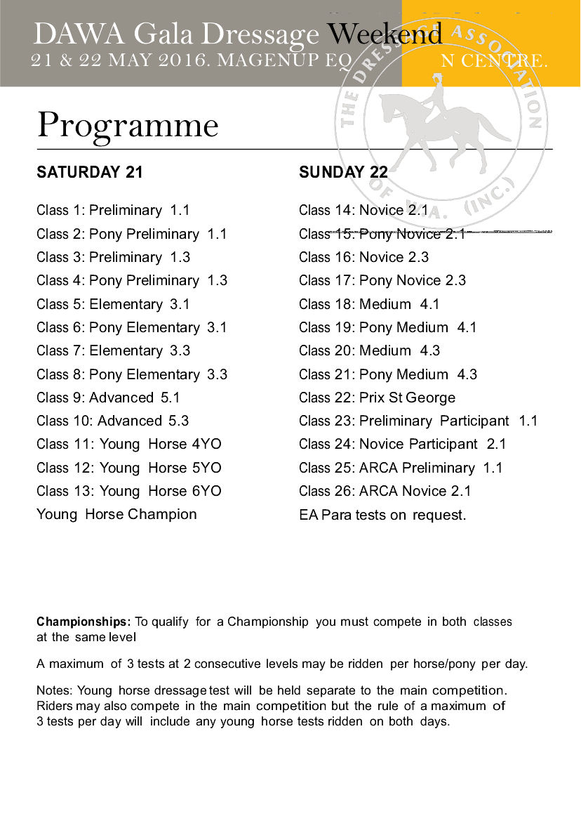 Notes: Young horse dressage test will be held separate to the main competition. Riders may also compete in the main competition but the rule of a maximum of 3 tests per day will include any young horse tests ridden on both days. Ground fee is payable once only.